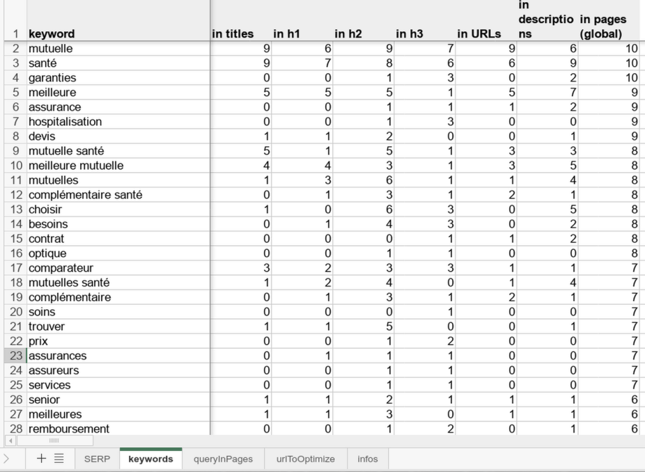 - ajout d’un onglet avec les meilleurs mots-clés des pages de la SERP (onglet keywords),